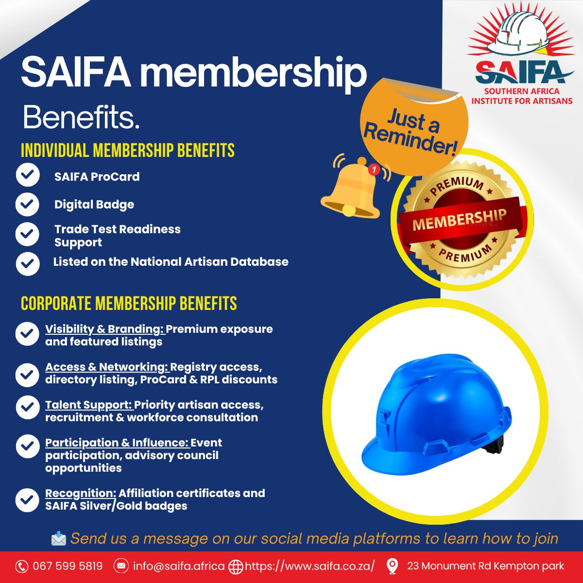SAIFA offers membership opportunities for artisans, training providers, and industry stakeholders. Members gain access to development programmes, certification pathways, mentorship, and placement opportunities.